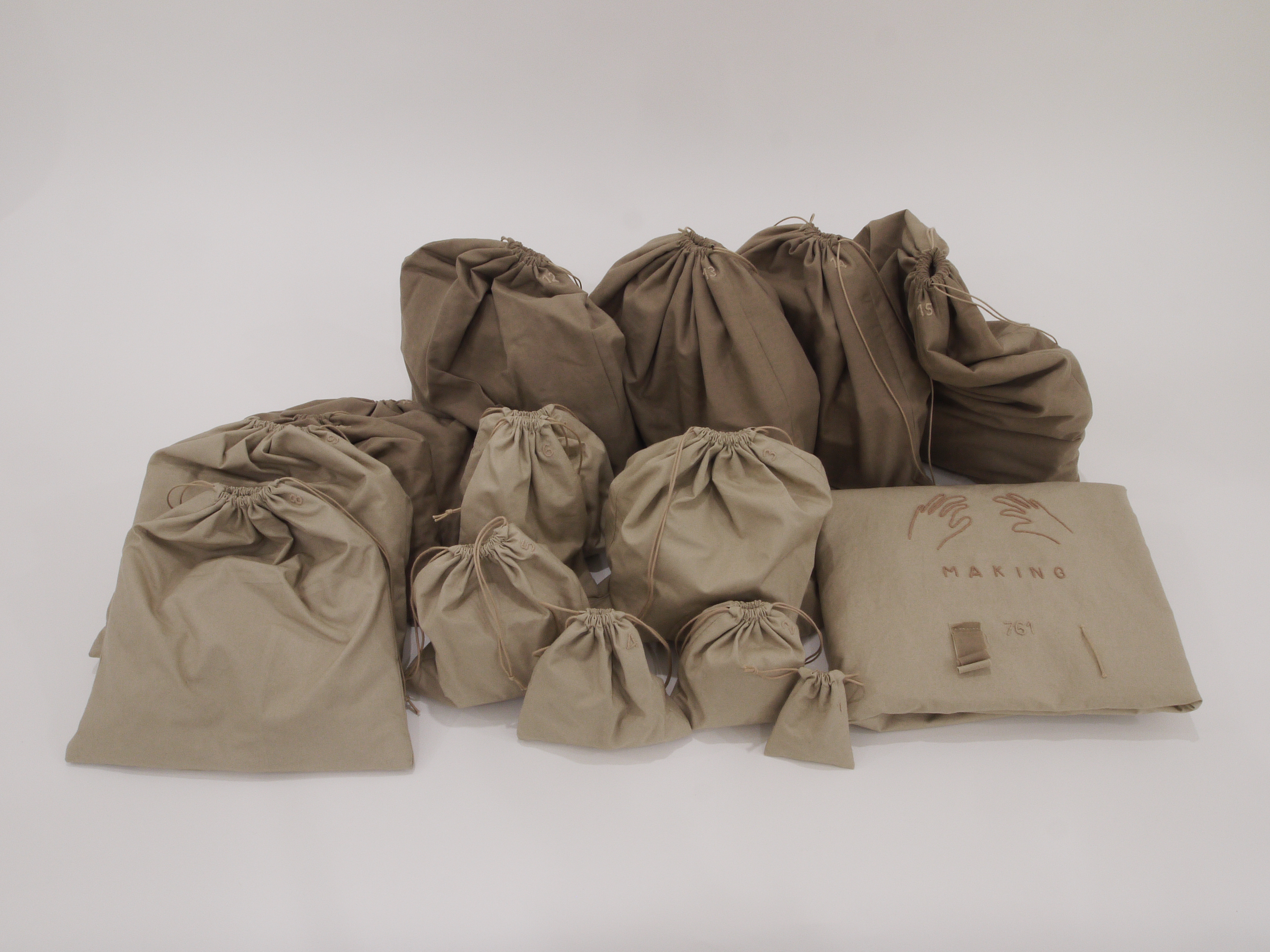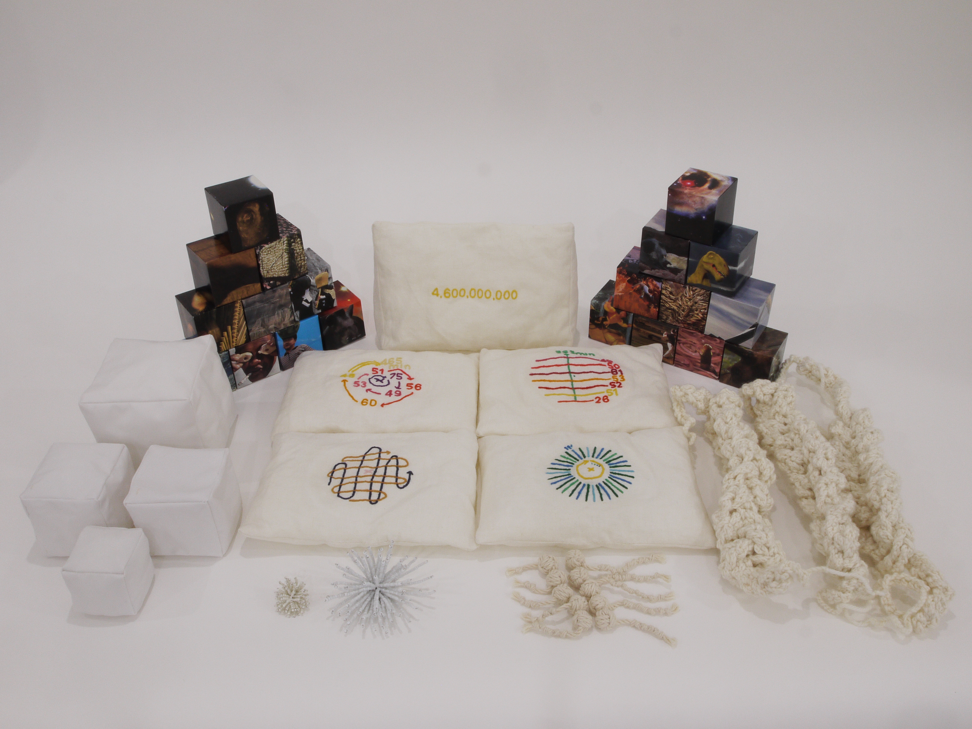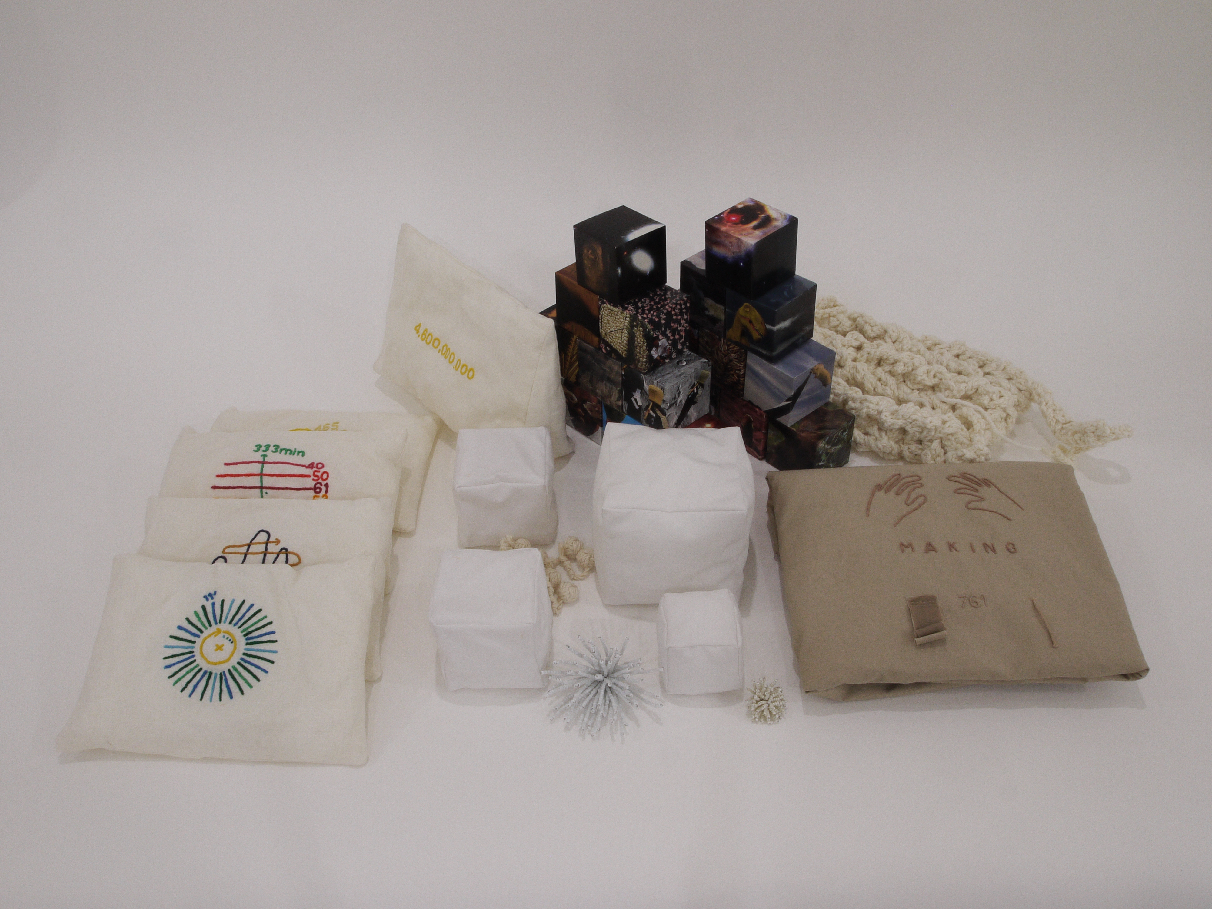 Two beaded items, three stuffed fabric cubes, one hollow fabric cube, a set of ten monkey’s fist knot, five embroidered small cushions, two sets of ten paper cubes, a set of three chain stitched yarn, embroidered smock and pouches