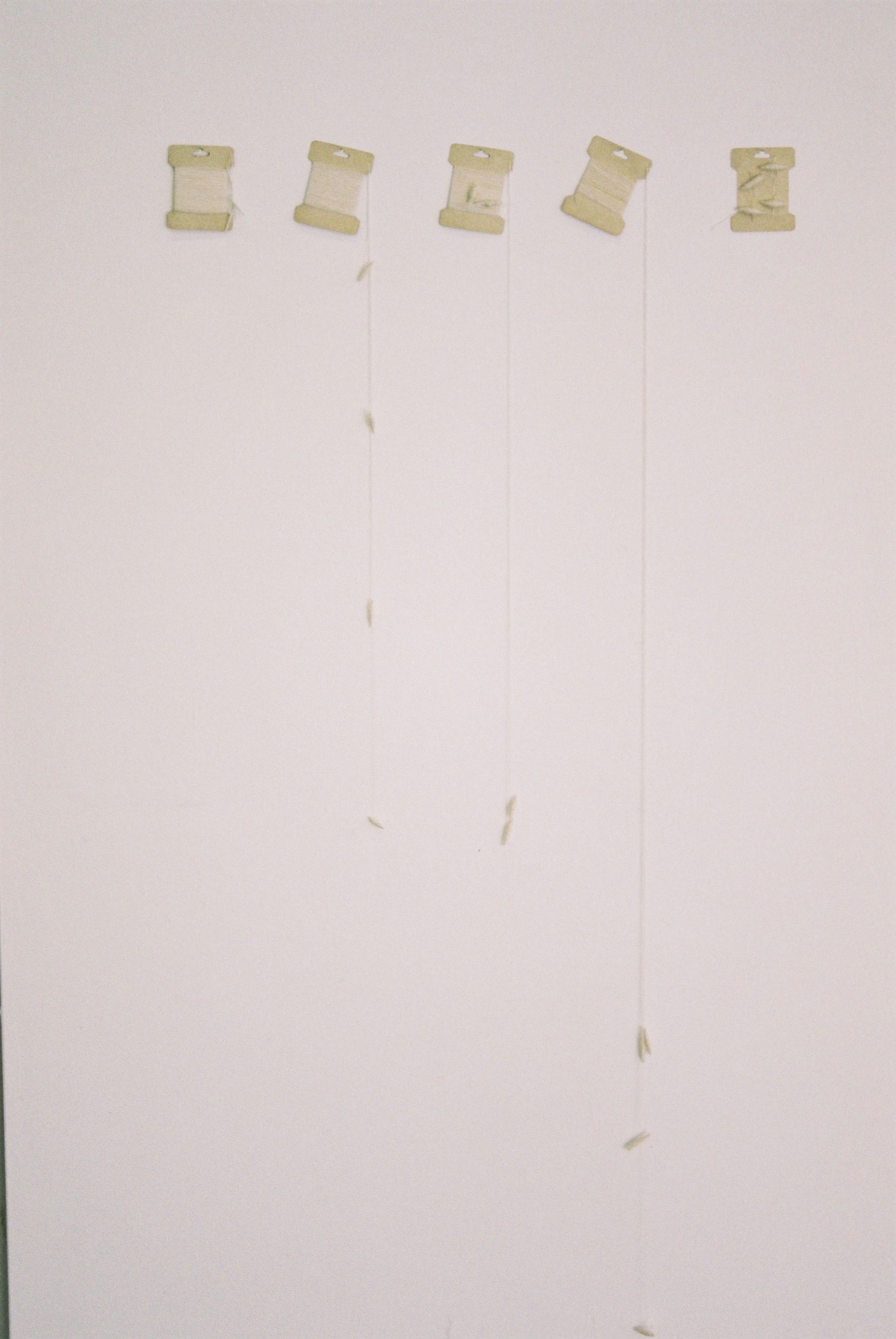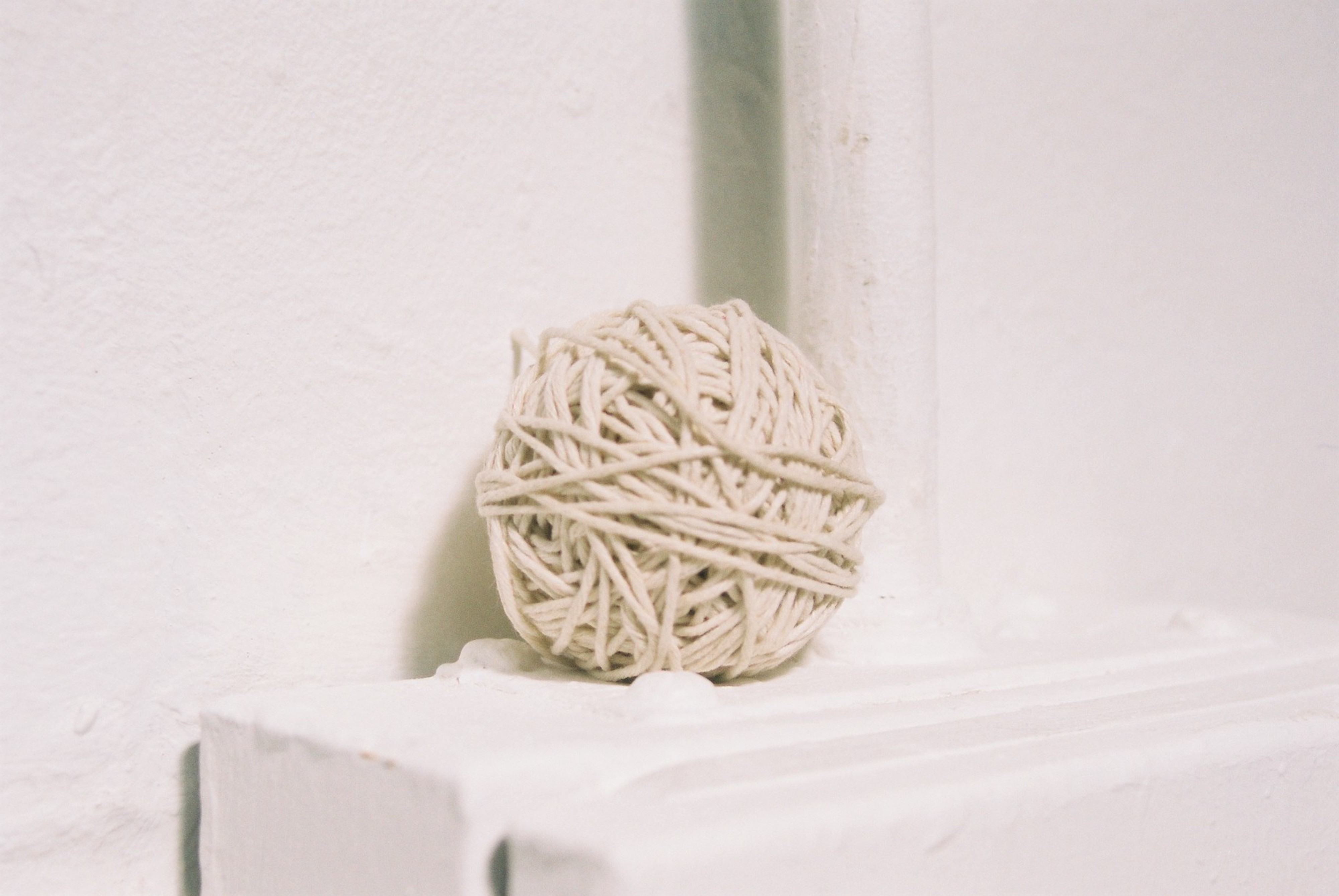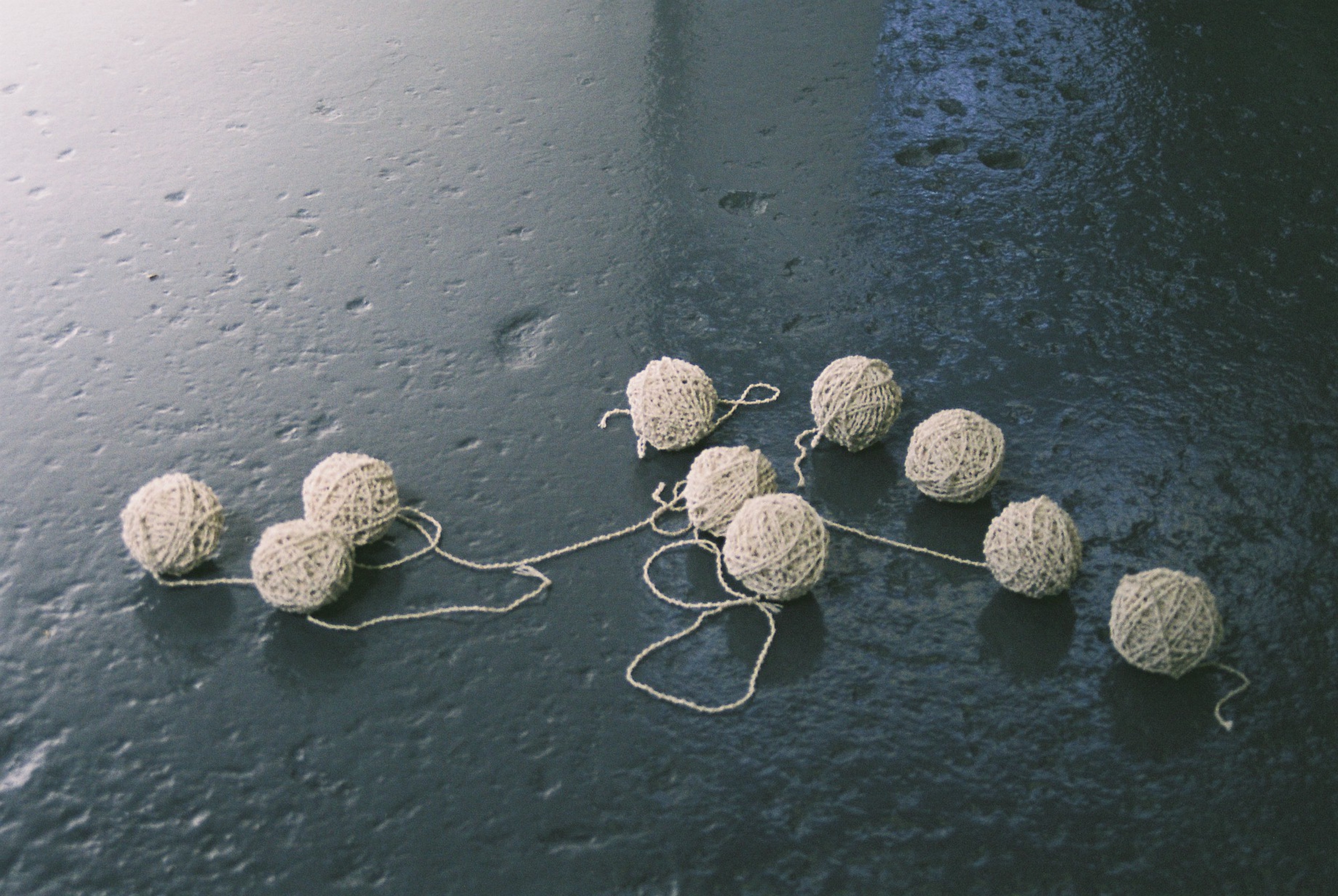 10 m cotton rope split into individual strands and rolled into displayed in sequence, pins, display case
