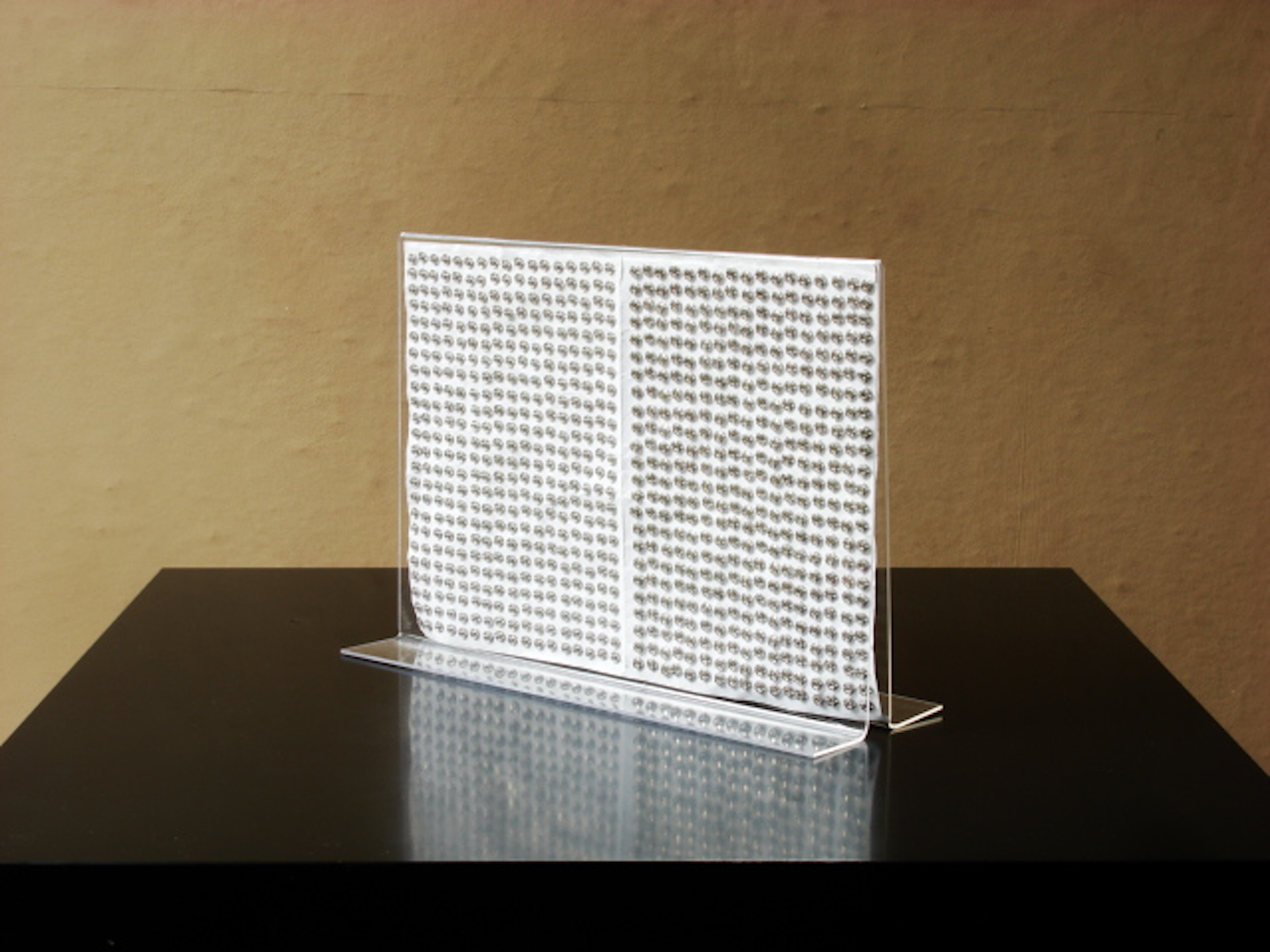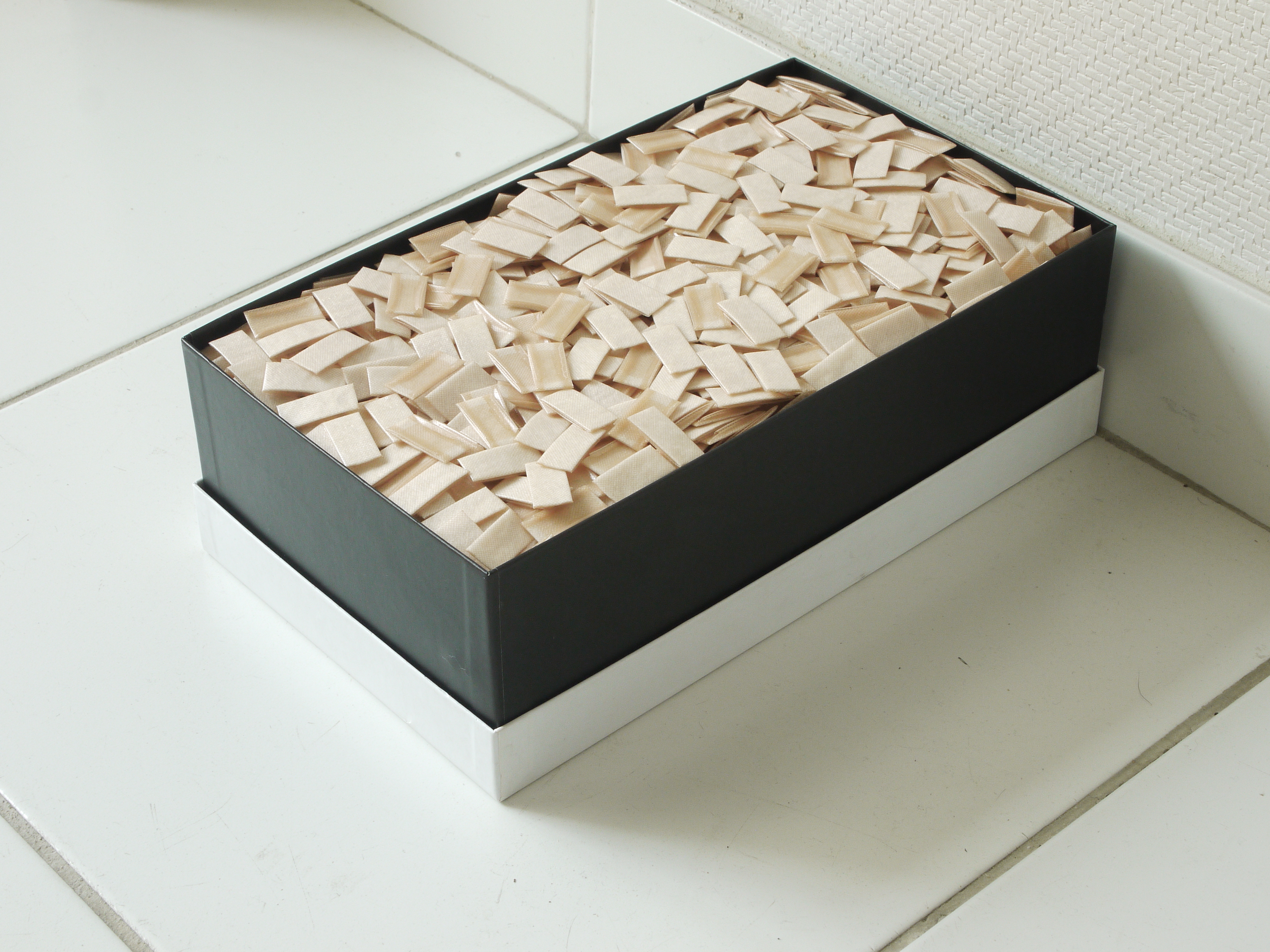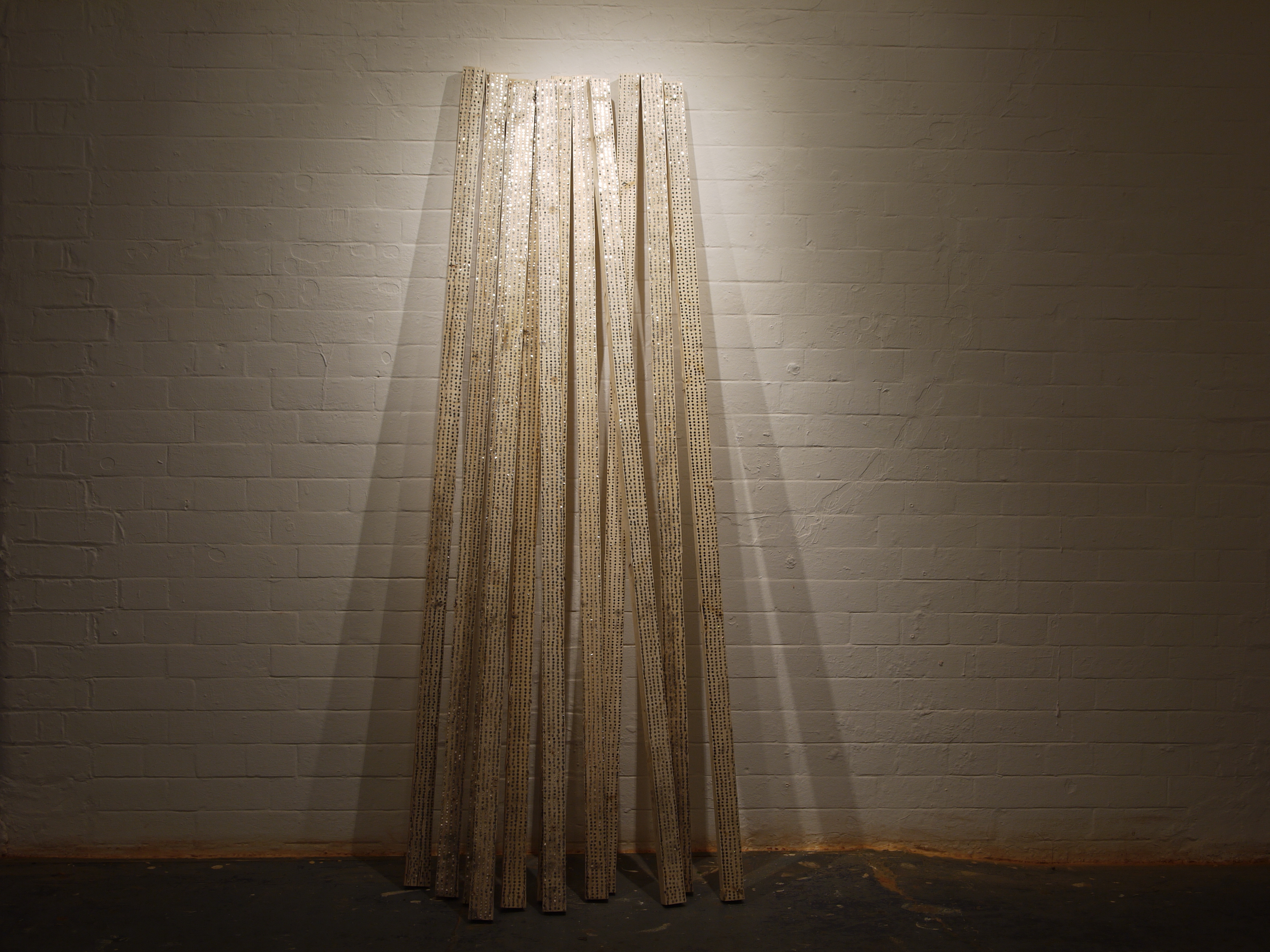 10 m cotton rope split into individual strands and rolled into displayed in sequence, pins, display case