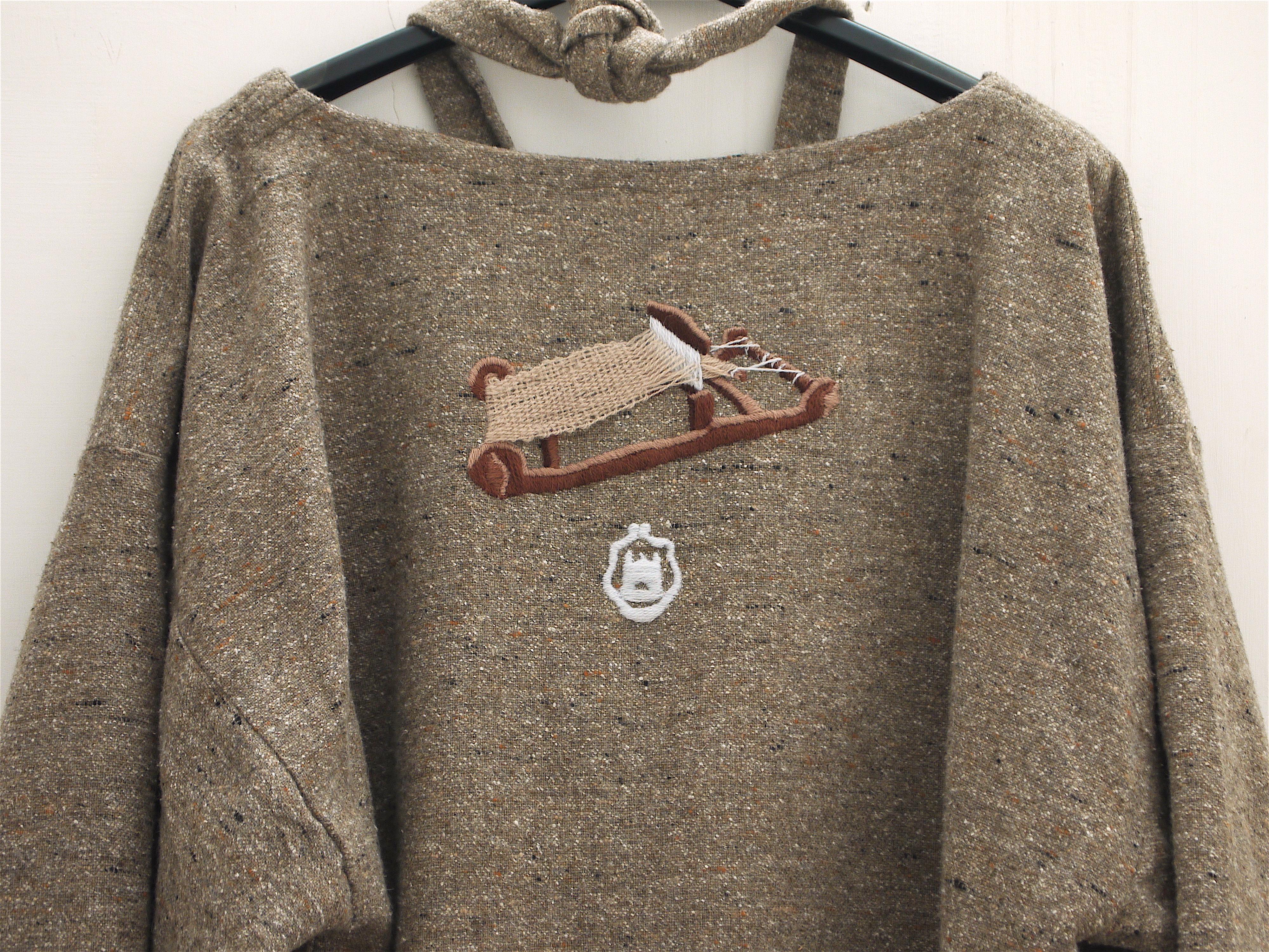 Yarn (linen, cotton), thread (cotton, polyester), fabric (wool), crewel wool, stabiliser, ink on A4 paper, glue, acrylic display case, stainless steel pipes, metal joints, hanger, wire