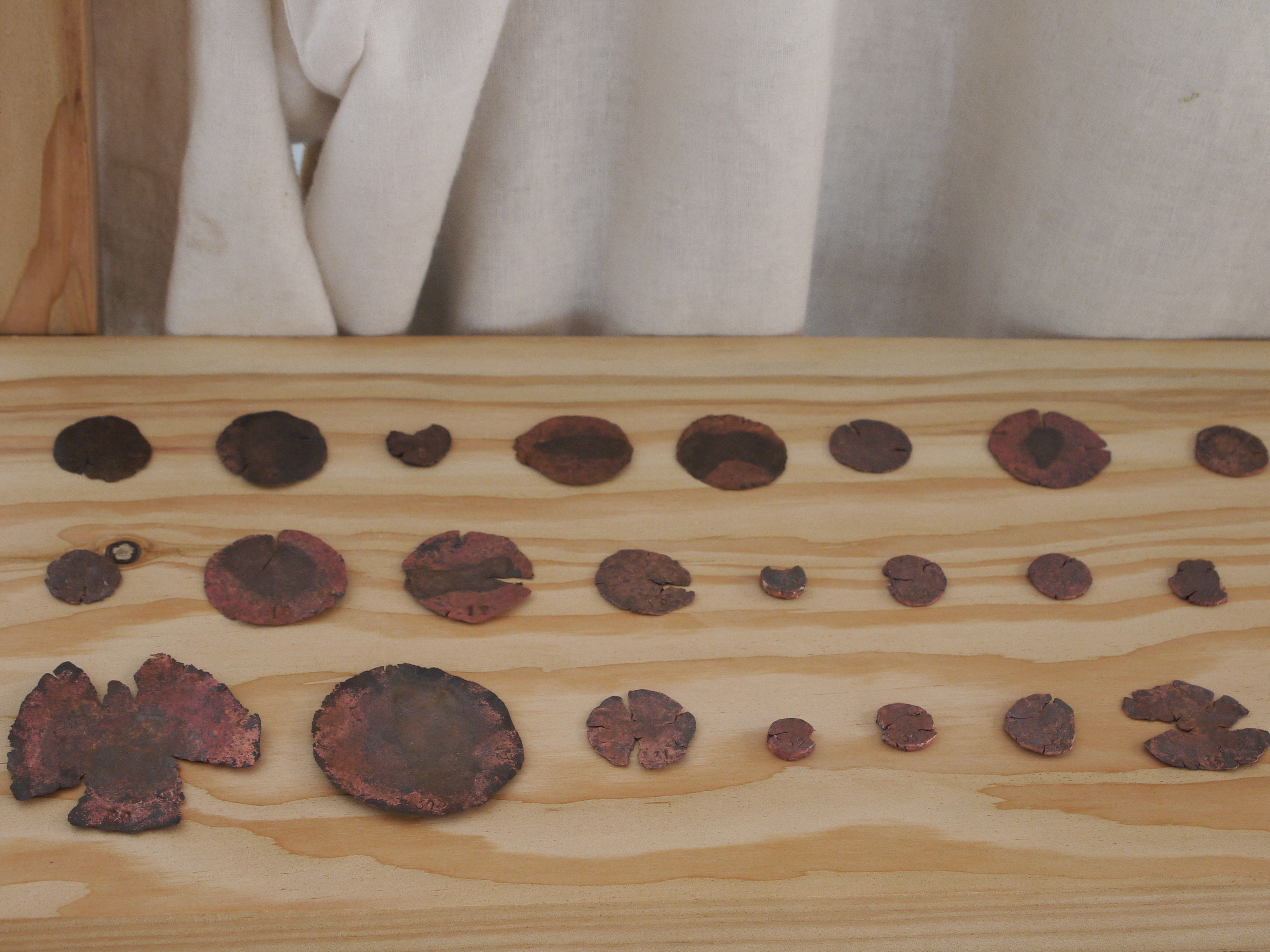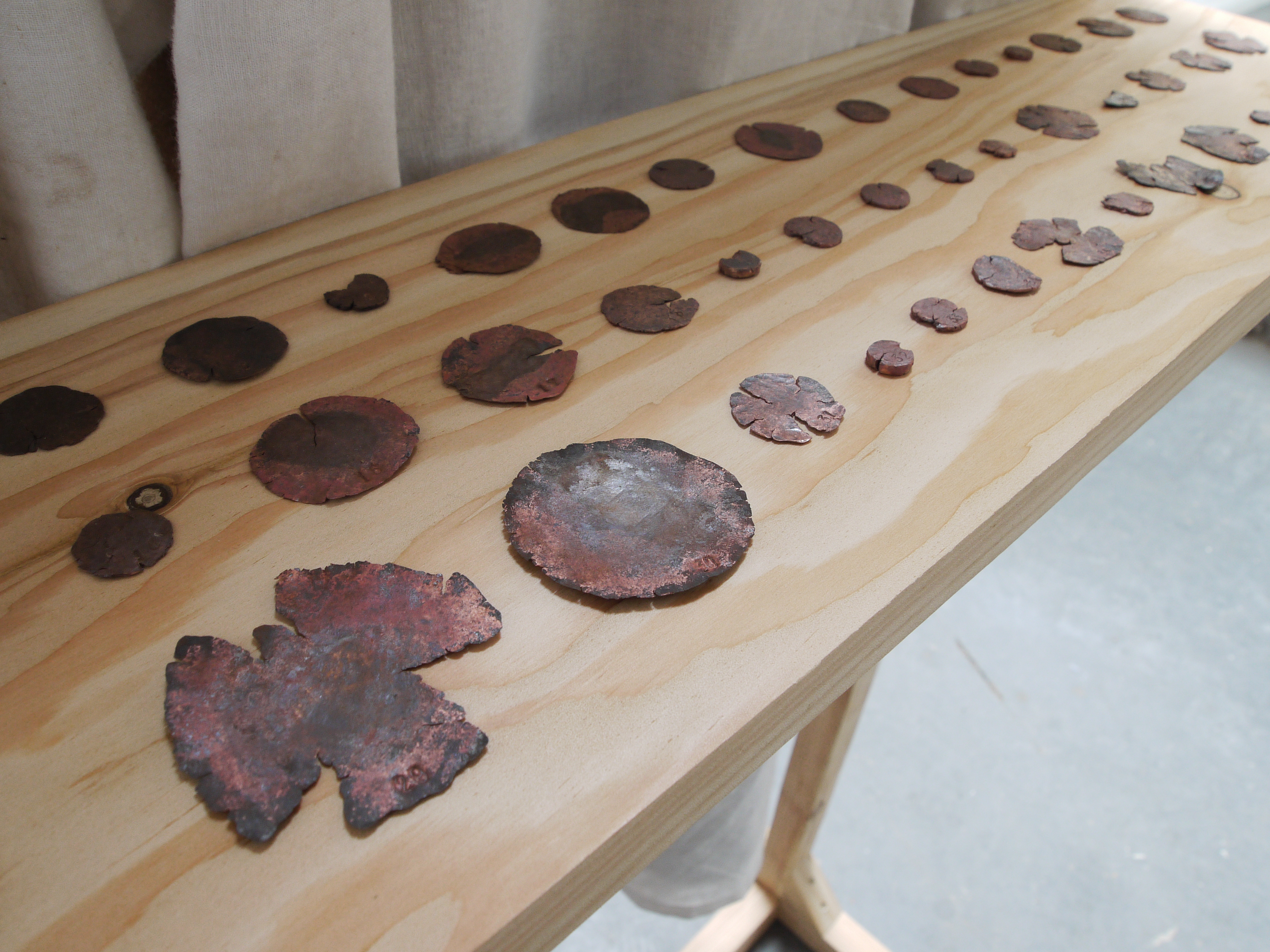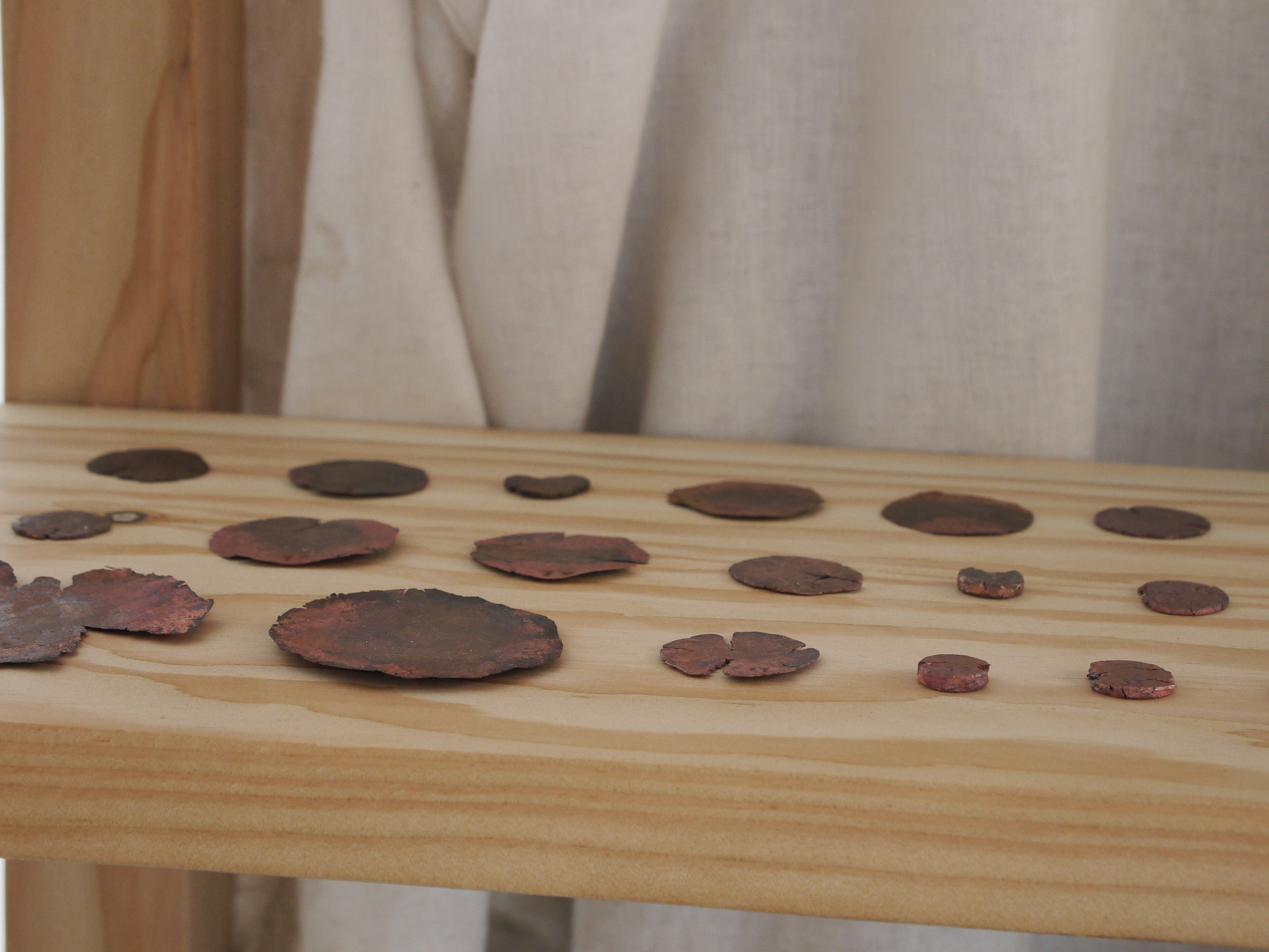 Copper extracted from malachite, embroidered dress, larch timber, hooks, screws