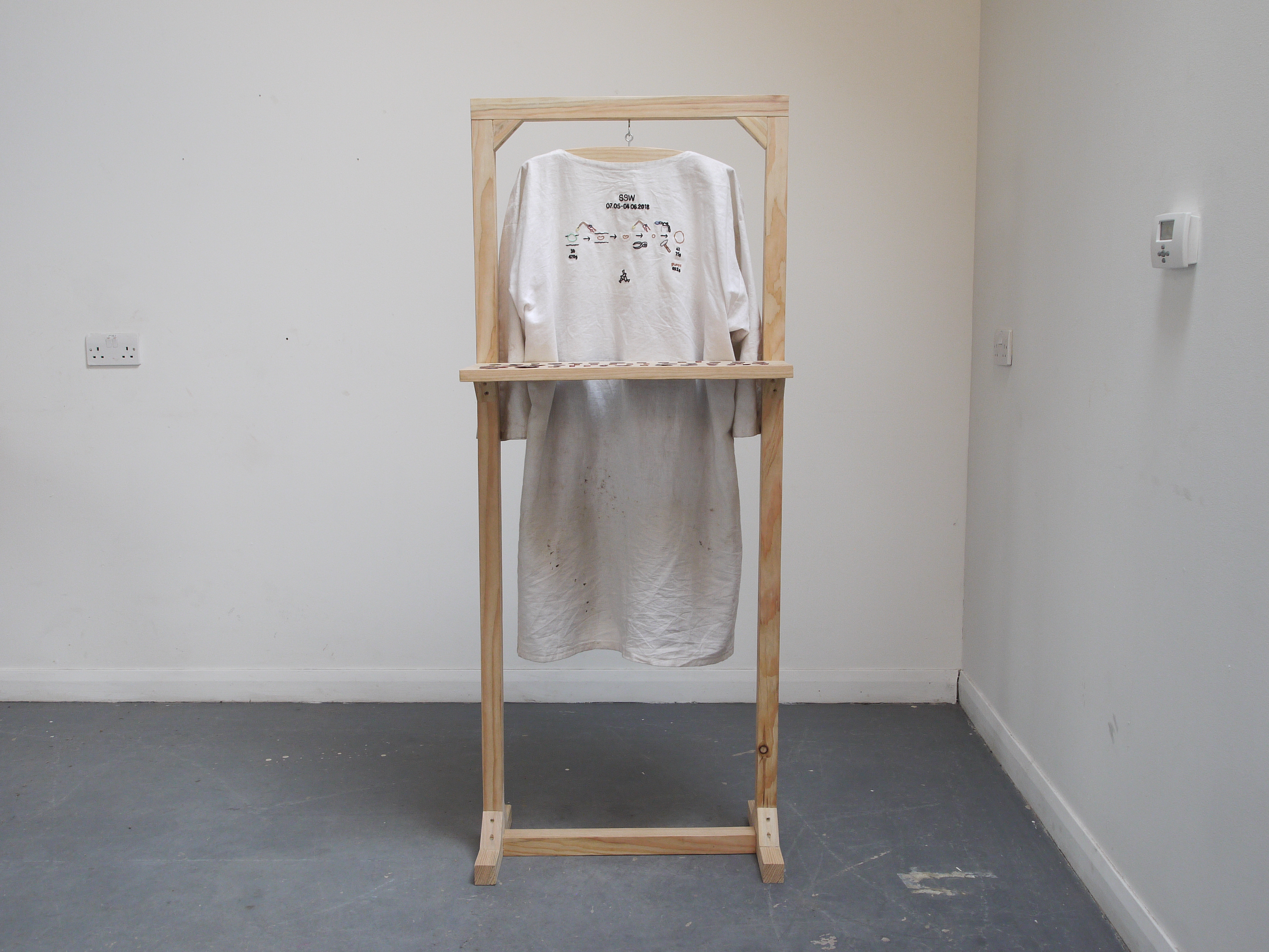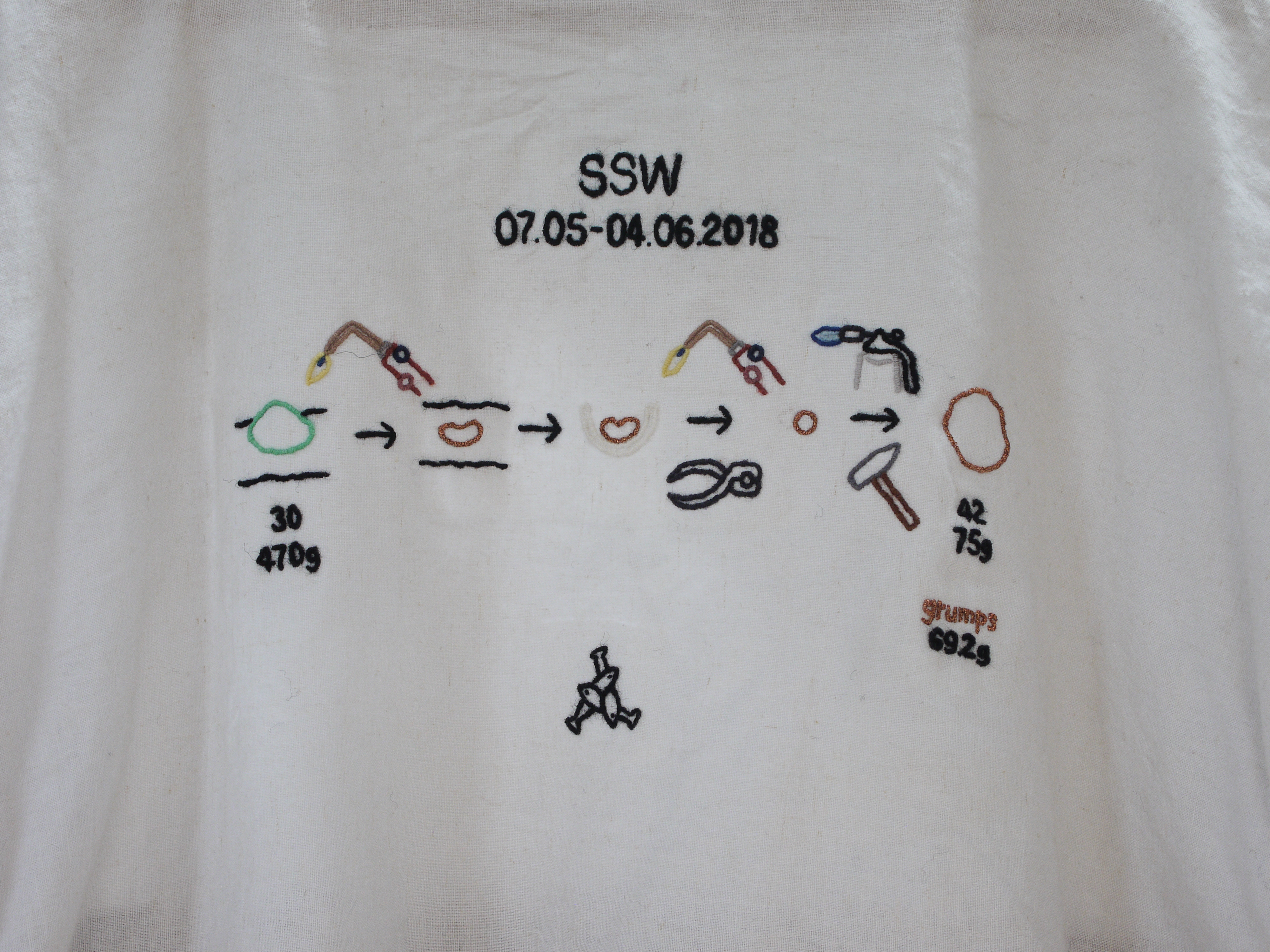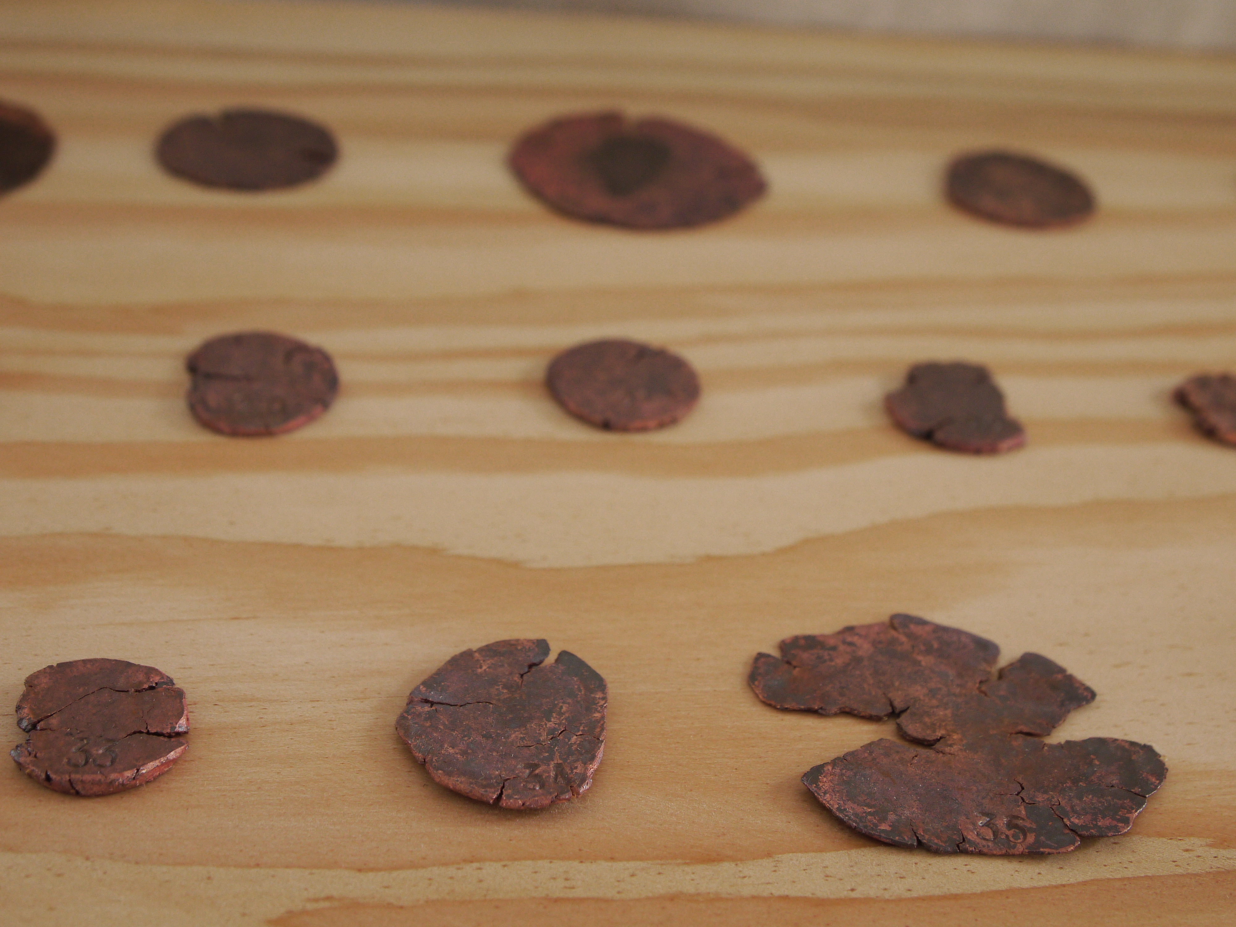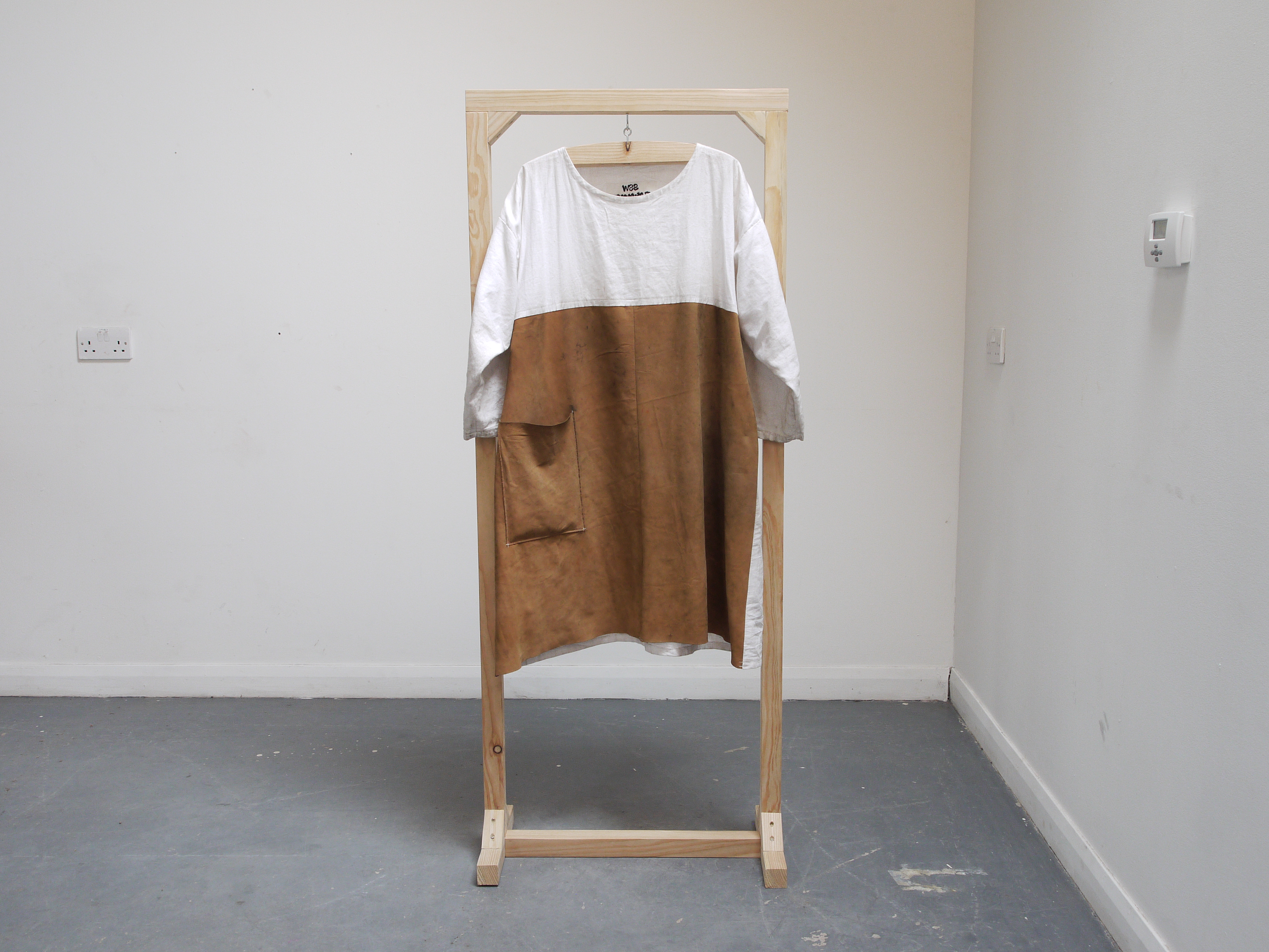 Copper extracted from malachite, embroidered dress, larch timber, hooks, screws