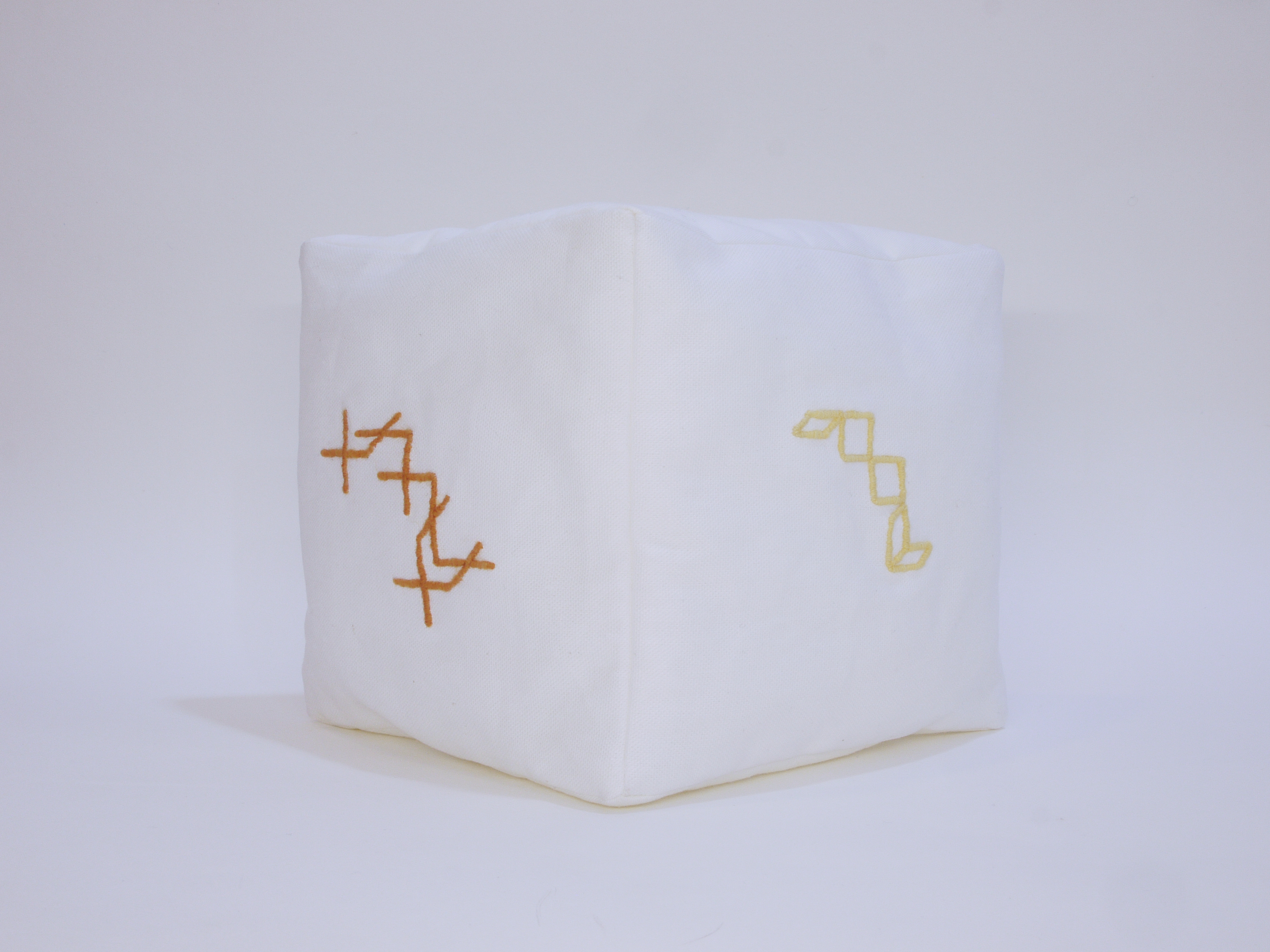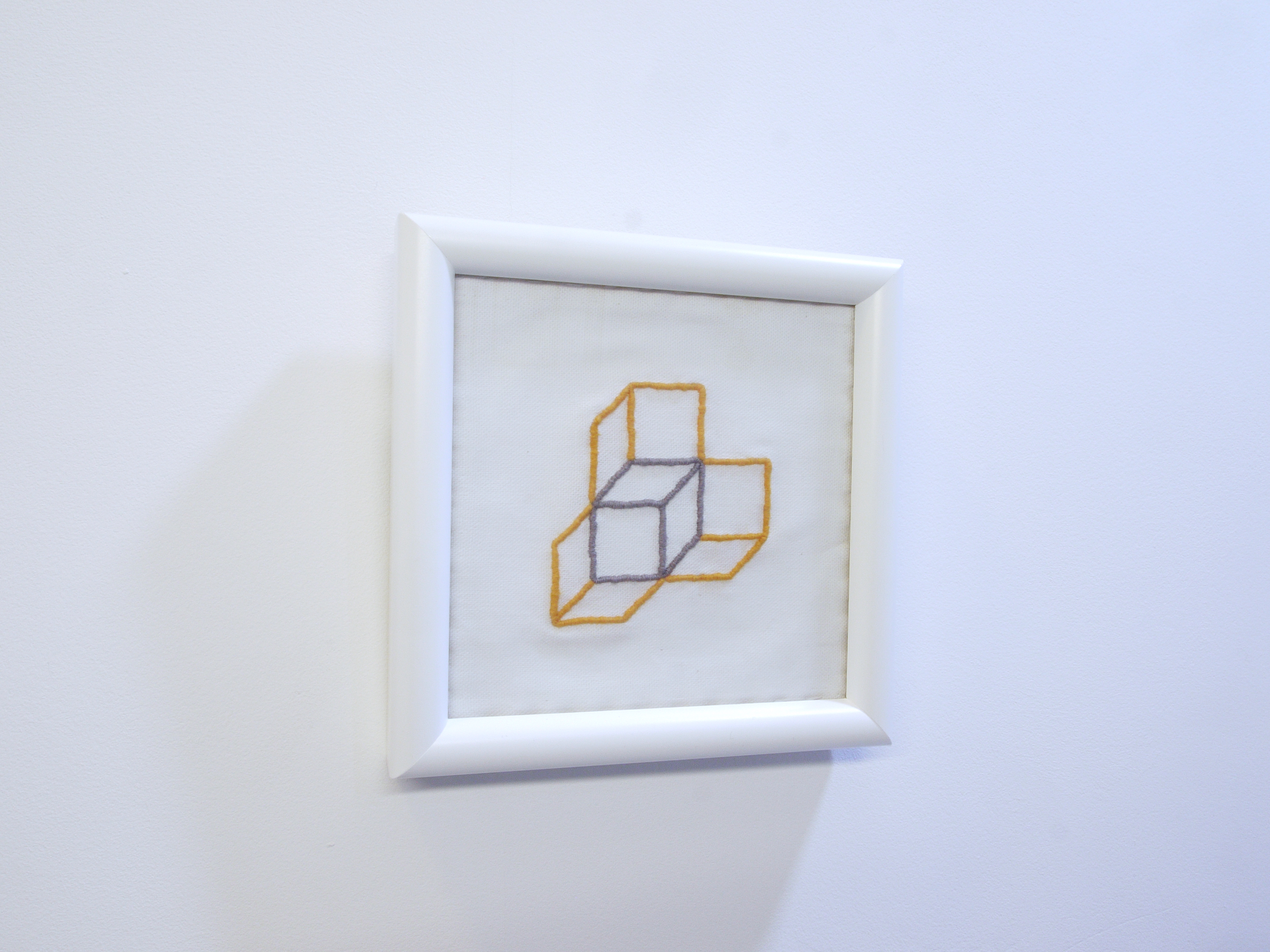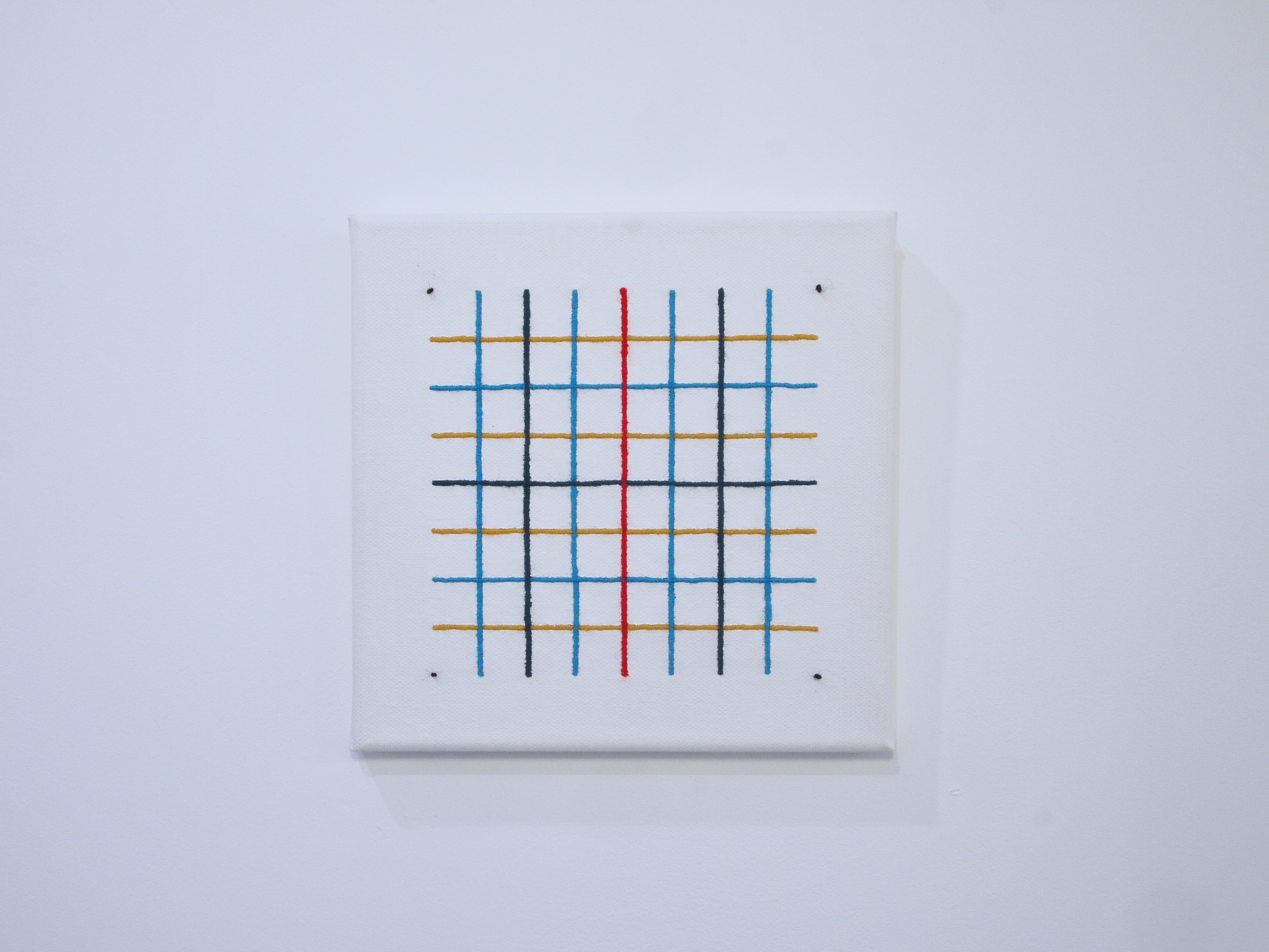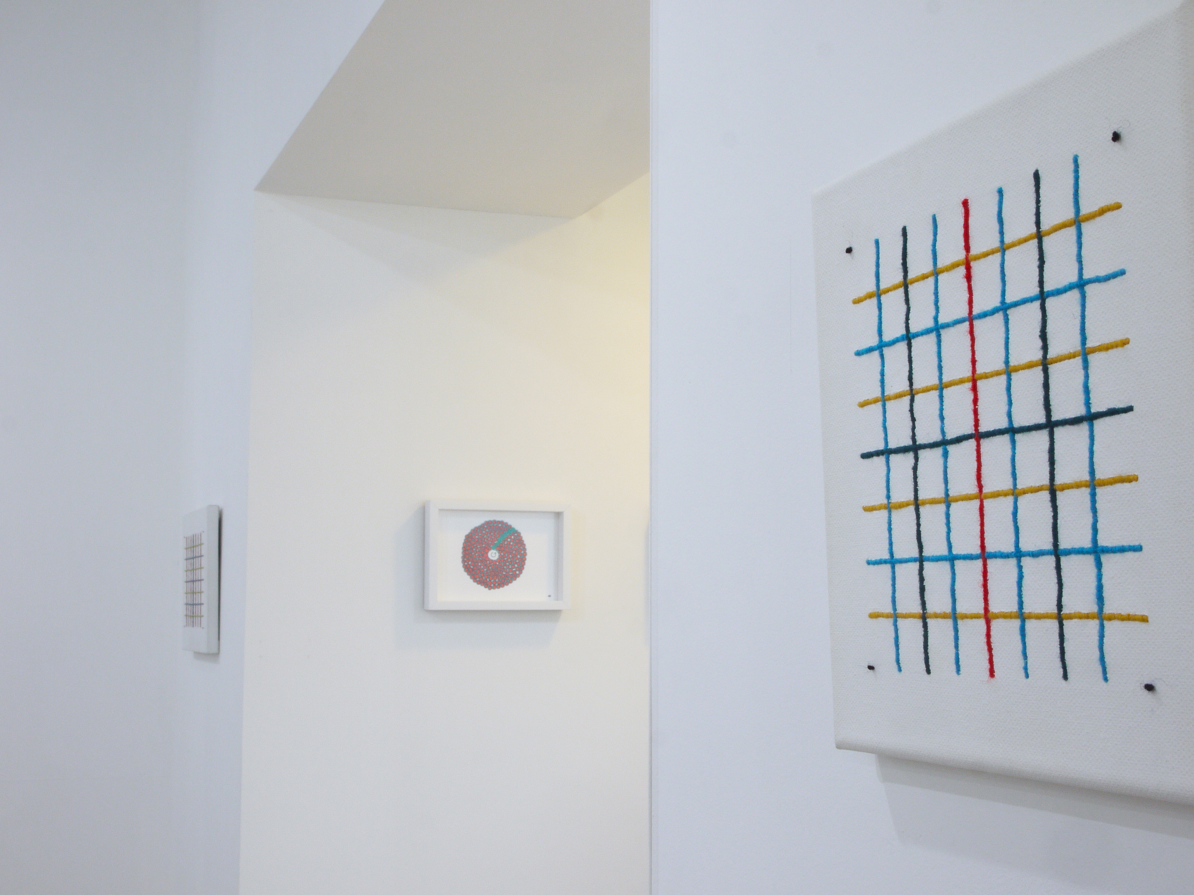 Colored pencil, embroidery thread, paper, pen, permanent marker, stamp ink, string